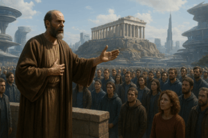 Paulus ging midden op de Areopagus staan en nam het woord.: “Mannen van Athene, ik zie aan alles hoe diep godsdienstig gij zijt. Want toen ik rondliep en bekeek wat gij zoal vereert, ontdekte ik zelfs een altaar met het opschrift: Aan een onbekende god. Welnu, wat gij vereert zonder het te kennen, dat kom ik u verkondigen.